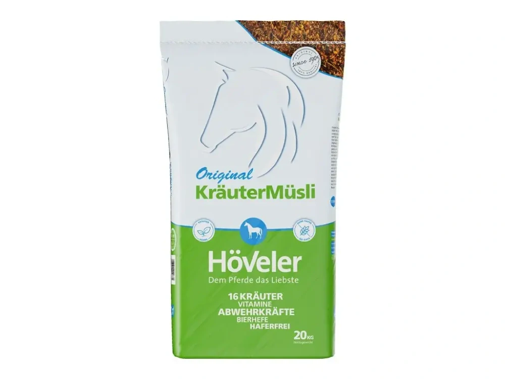 Höveler KräuterMüsli je doplňkové krmivo pro koně s dýchacími potížemi. Vybraná směs přírodních bylinek dělá automaticky krmivo aromatickým a velmi chutným, přidané pivovarské kvasnice pak zaručují dostatečný přísun vitamínu B. Nejen nízký obsah stravitelné bílkoviny a stravitelné energie, ale také jejich propojení, dělají směs plnohodnotným doplňkem, který se dá podávat v libovolných dávkách. Ke zdokonalení poměru vitamínů, minerálů a stopových prvků dopomáhá také extrudovaná mrkev.